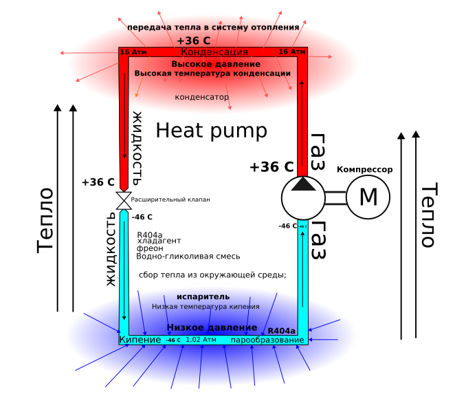 После извлечения тепла из земли, процесс внутри теплового насоса идентичен: хладагент испаряется, сжимается компрессором, конденсируется и отдает тепло в систему отопления дома.
